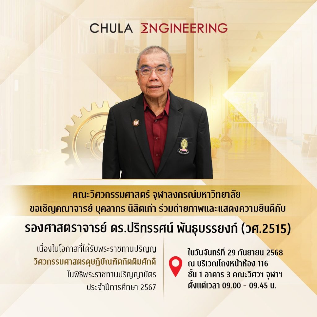 ขอเชิญคณาจารย์ บุคลากร นิสิตเก่า ร่วมถ่ายภาพและแสดงความยินดีกับ รศ. ดร.ปริทรรศน์ พันธุบรรยงก์ (วศ.2515) เนื่องในโอกาสที่ได้รับพระราชทานปริญญาวิศวกรรมศาสตรดุษฎีบัณฑิตกิตติมศักดิ์ ในพิธีพระราชทานปริญญาบัตร ประจำปีการศึกษา 2567