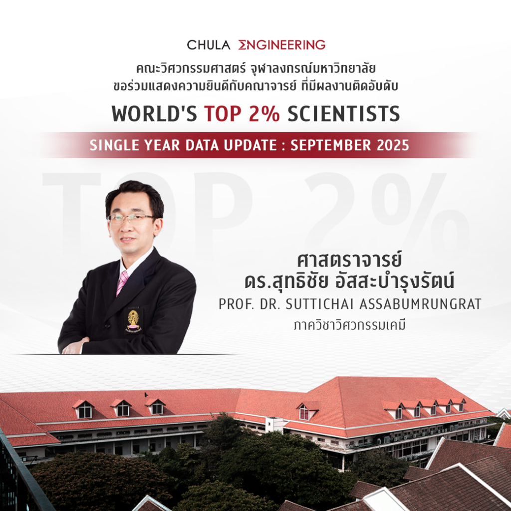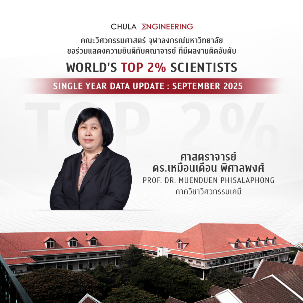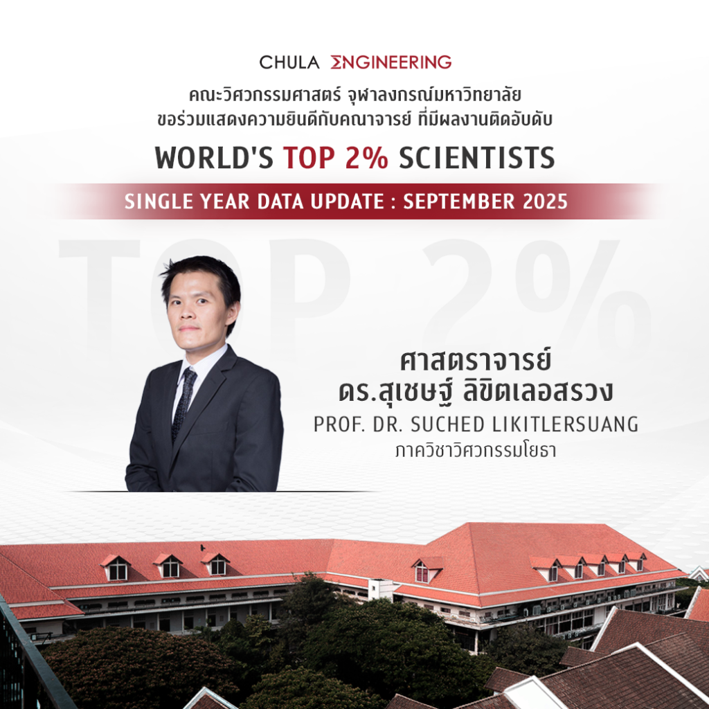 คณะวิศวกรรมศาสตร์ จุฬาลงกรณ์มหาวิทยาลัย ขอร่วมแสดงความยินดีกับคณาจารย์วิศวฯ ที่มีผลงานวิจัยที่ตีพิมพ์และได้รับการอ้างอิงสูงที่สุดในโลก ติดอันดับฐานข้อมูลกลุ่มนักวิทยาศาสตร์ชั้นนำระดับโลก World’s Top 2% Scientists ประเภท single year data จากการเก็บข้อมูลของ ELSEVIER อัปเดตเมื่อเดือนกันยายน 2568 ดังนี้