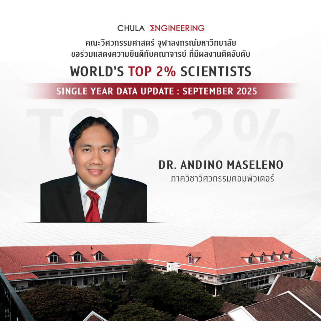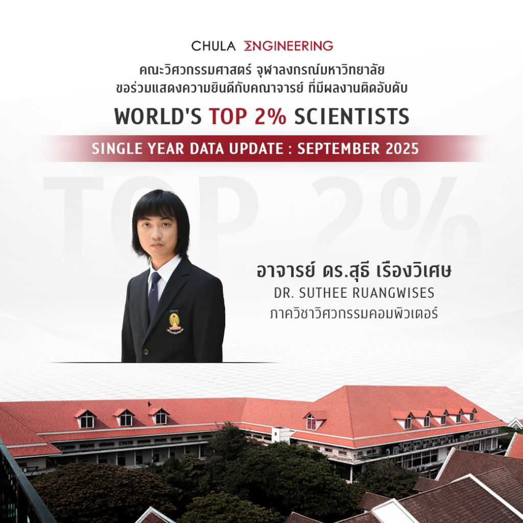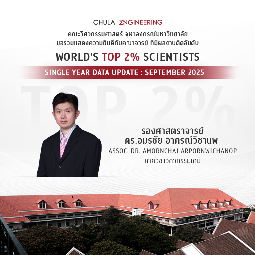 คณะวิศวกรรมศาสตร์ จุฬาลงกรณ์มหาวิทยาลัย ขอร่วมแสดงความยินดีกับคณาจารย์วิศวฯ ที่มีผลงานวิจัยที่ตีพิมพ์และได้รับการอ้างอิงสูงที่สุดในโลก ติดอันดับฐานข้อมูลกลุ่มนักวิทยาศาสตร์ชั้นนำระดับโลก World’s Top 2% Scientists ประเภท single year data จากการเก็บข้อมูลของ ELSEVIER อัปเดตเมื่อเดือนกันยายน 2568 ดังนี้
