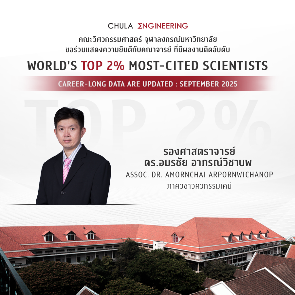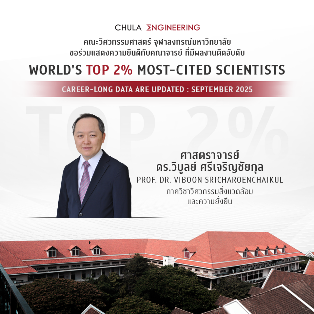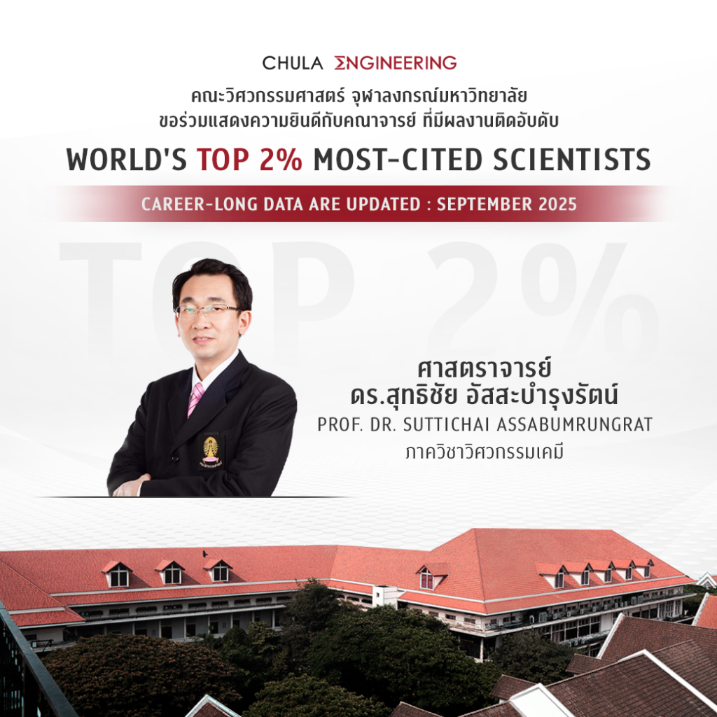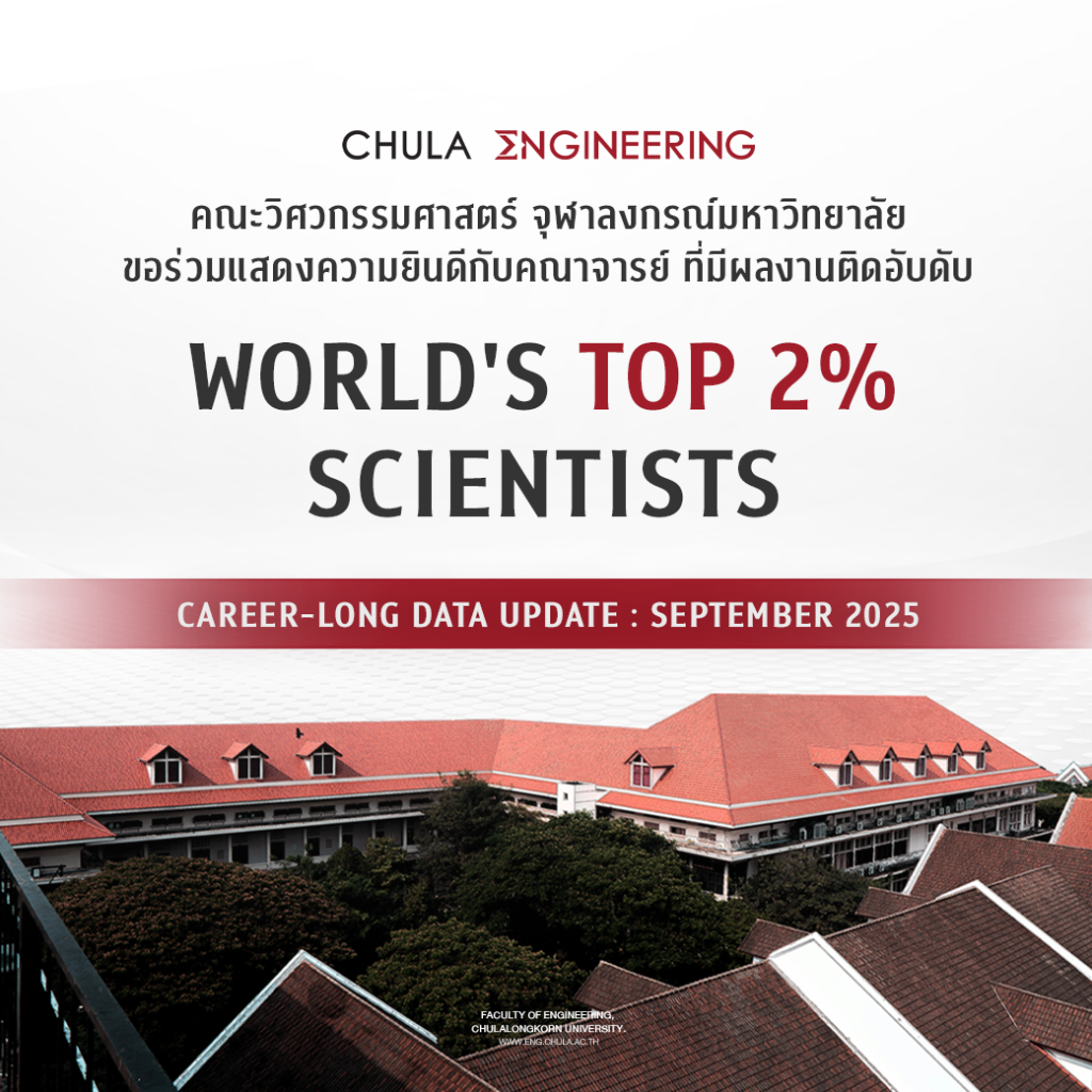 คณะวิศวกรรมศาสตร์ จุฬาลงกรณ์มหาวิทยาลัย ขอร่วมแสดงความยินดีกับคณาจารย์วิศวฯ ที่มีผลงานวิจัยที่ตีพิมพ์และได้รับการอ้างอิงสูงที่สุดในโลก ติดอันดับฐานข้อมูลกลุ่มนักวิทยาศาสตร์ชั้นนำระดับโลก World’s Top 2% Scientists ประเภท Career-long data จากการเก็บข้อมูลของ ELSEVIER อัปเดตเมื่อเดือนกันยายน 2568 ดังนี้