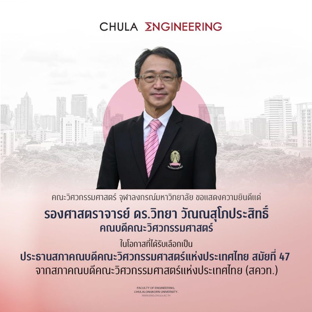 ขอแสดงความยินดีแด่ รองศาสตราจารย์ ดร.วิทยา วัณณสุโภประสิทธิ์ คณบดีคณะวิศวกรรมศาสตร์ ในโอกาสที่ได้รับเลือกเป็นประธานสภาคณบดีคณะวิศวกรรมศาสตร์แห่งประเทศไทย สมัยที่ 47 จากสภาคณบดีคณะวิศวกรรมศาสตร์แห่งประเทศไทย (สควท.)